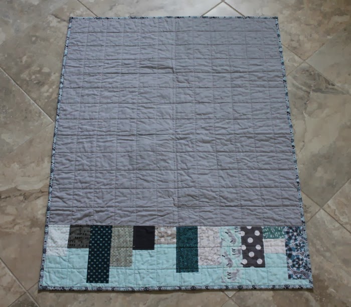 I have finished my first commissioned quilt! This quilt is for a baby boy that was born at the end of September. My customer's only stipulation was that it include fabric with a fox print. I found two fox prints that went well together and then moved forward with a blue and grey color scheme, pulling prints from my stash.